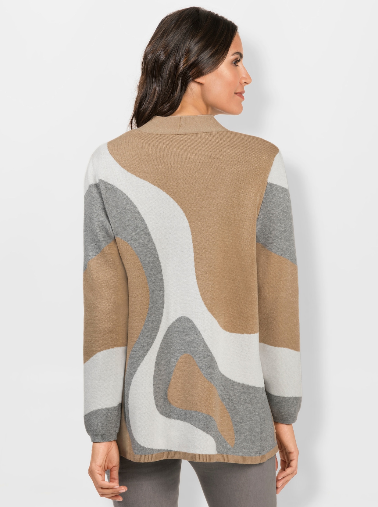 Vest van jacquard in open lang model - camel/steengrijs gedessineerd